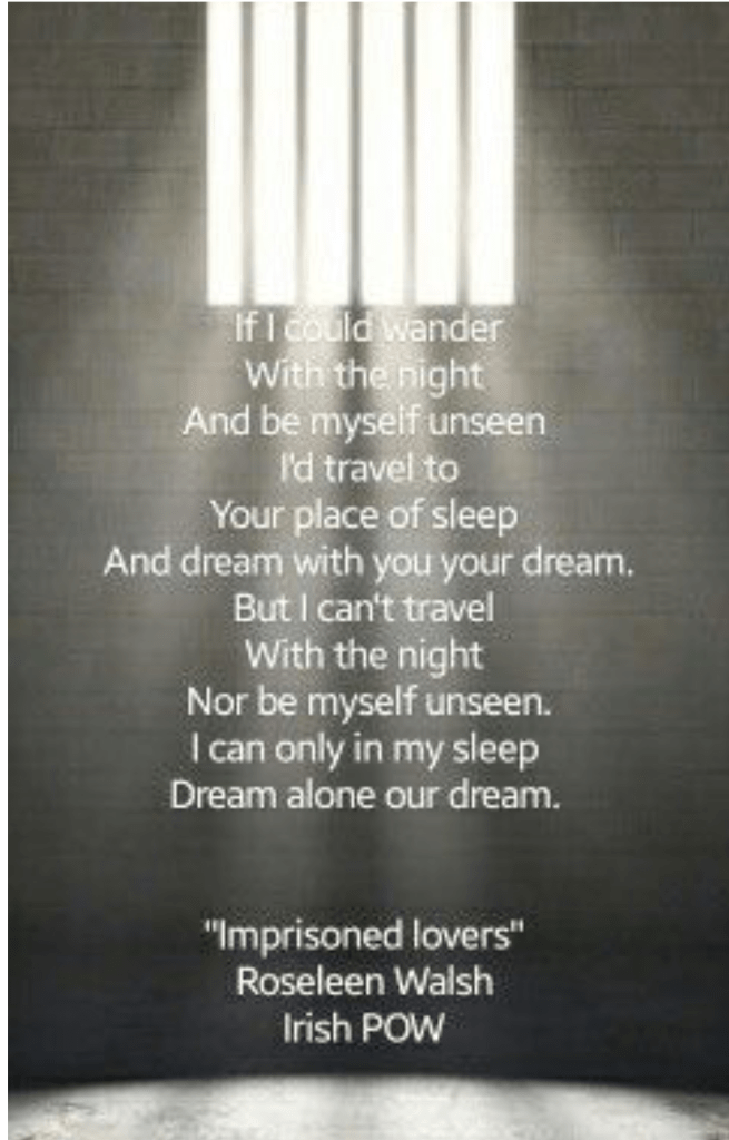Imprisoned Lovers Wrote this on my cell wall while I was interned in Armagh jail 45 years ago. Share this: Click to share on X (Opens in new window) X Click to share on Facebook (Opens in new window) Facebook Like Loading...